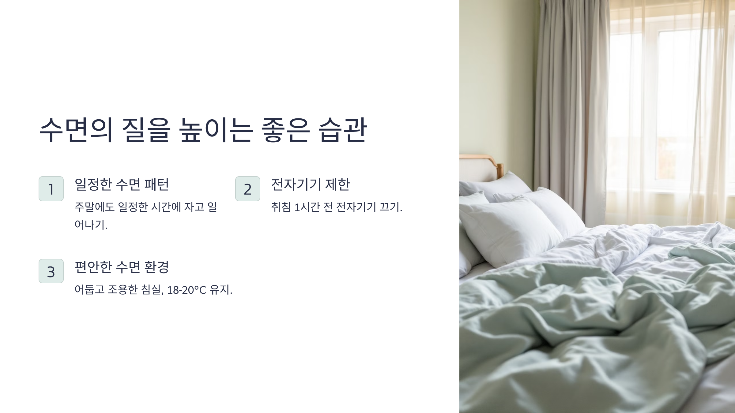 - 편안한 수면 환경 조성: 어둡고 조용한 침실을 만들고, 베개와 매트리스도 편안하게 조정하세요. 실내 온도는 18-20°C가 이상적이에요.