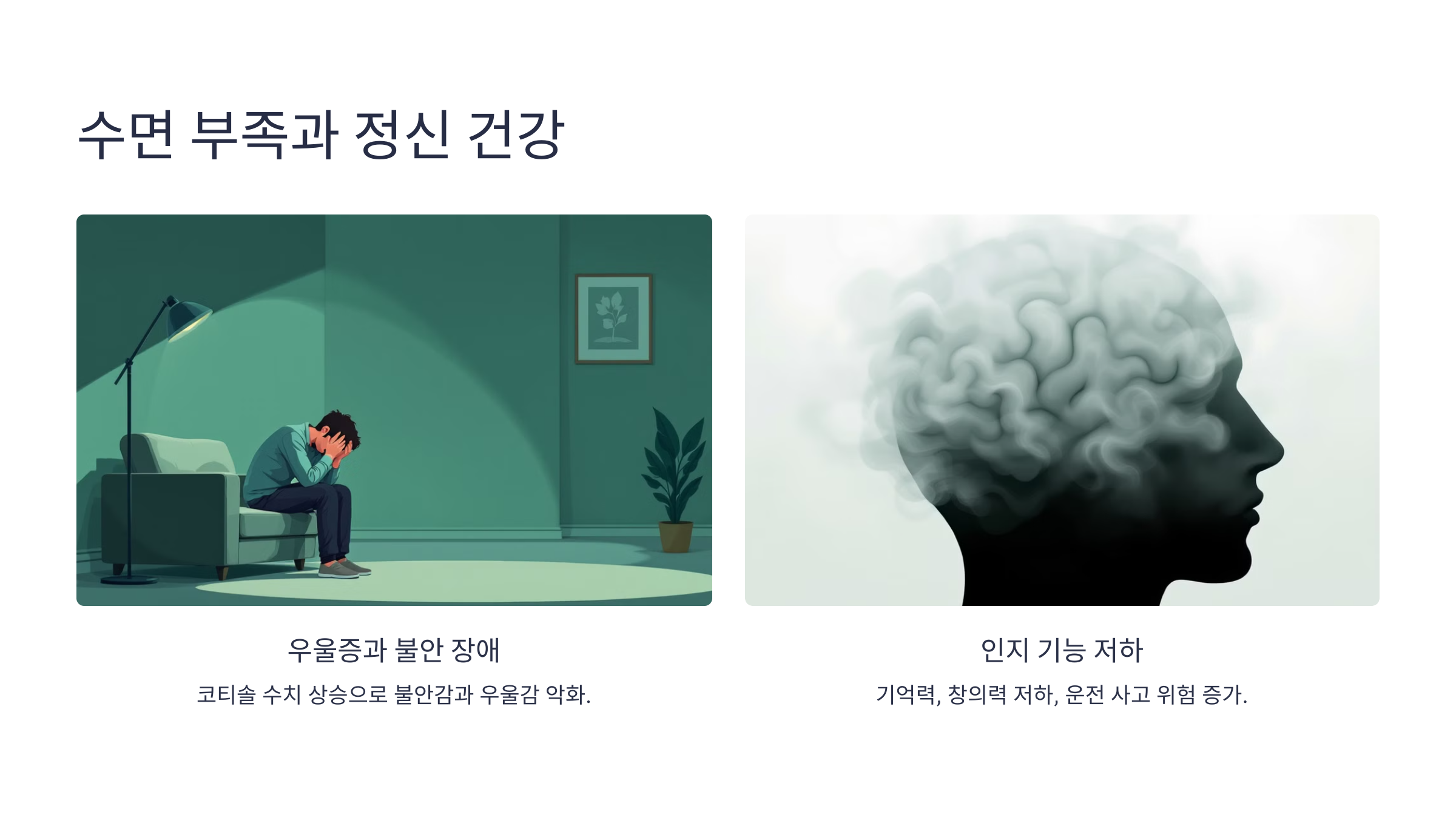 - "수면이 부족하면 뇌의 회복 기능이 저하돼요." 이로 인해 집중력과 기억력이 떨어지고, 스트레스에 더 취약해지며, 우울증 같은 정신 건강 문제도 유발할 수 있어요.