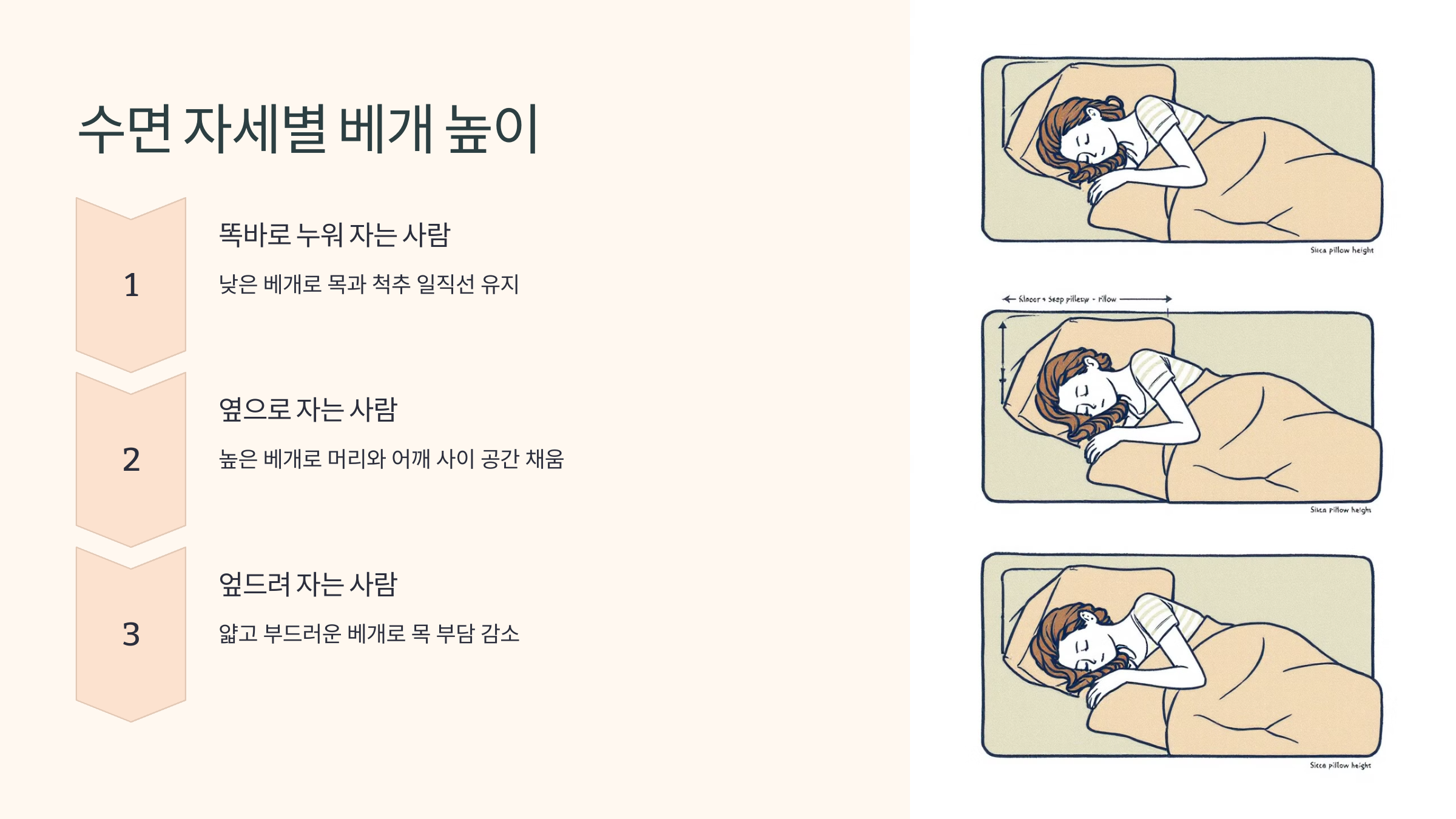 💡 Tip: 수면 자세를 스스로 점검해보세요. 평소 어떤 자세로 자는지에 따라 베개 높이를 결정하는 게 중요합니다!