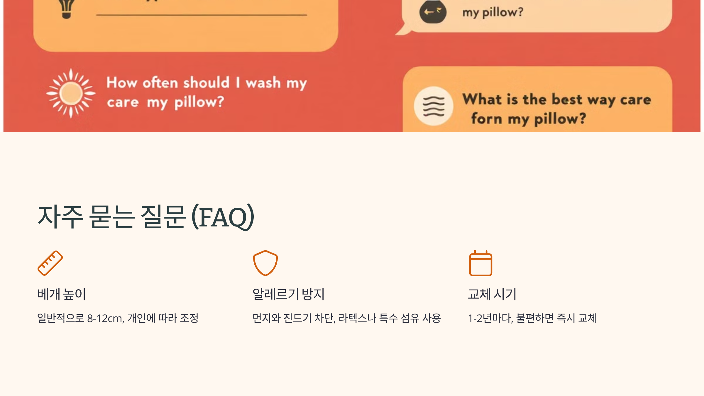 A: 일반적으로 1-2년마다 교체하세요. 베개가 납작해지거나 목이 불편하면 바로 바꾸는 게 좋아요.