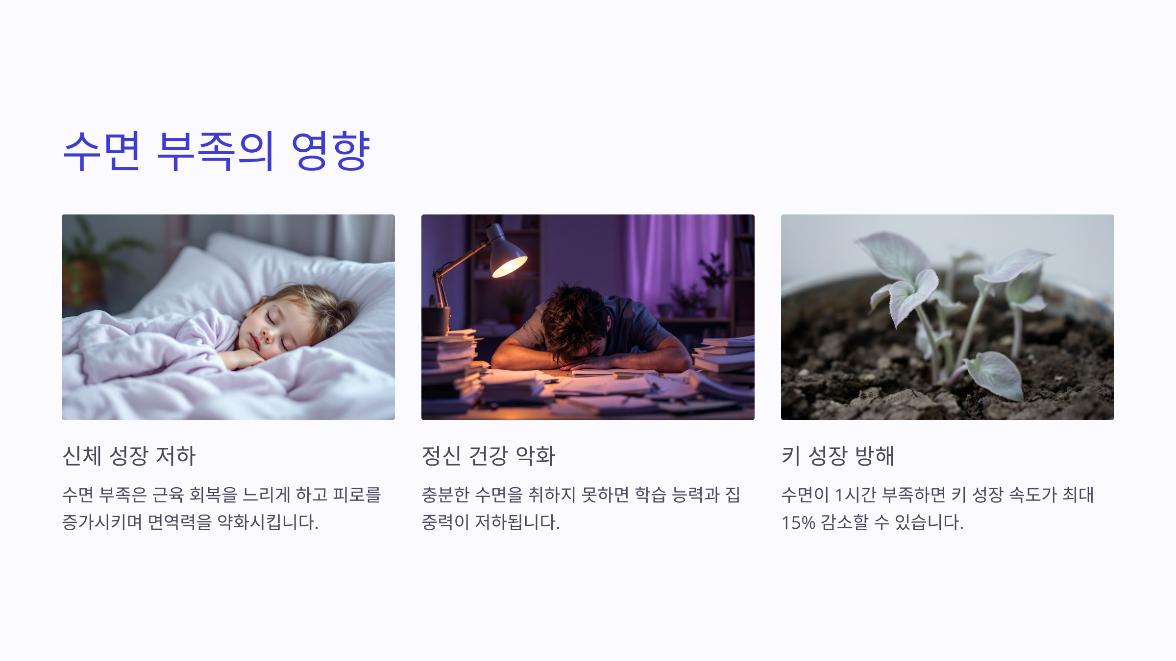 - 데이터에 따르면, 청소년들이 매일 1시간의 수면 부족을 겪을 때 평균적으로 키 성장 속도가 15% 감소한다고 해요. 생각보다 심각하죠?
