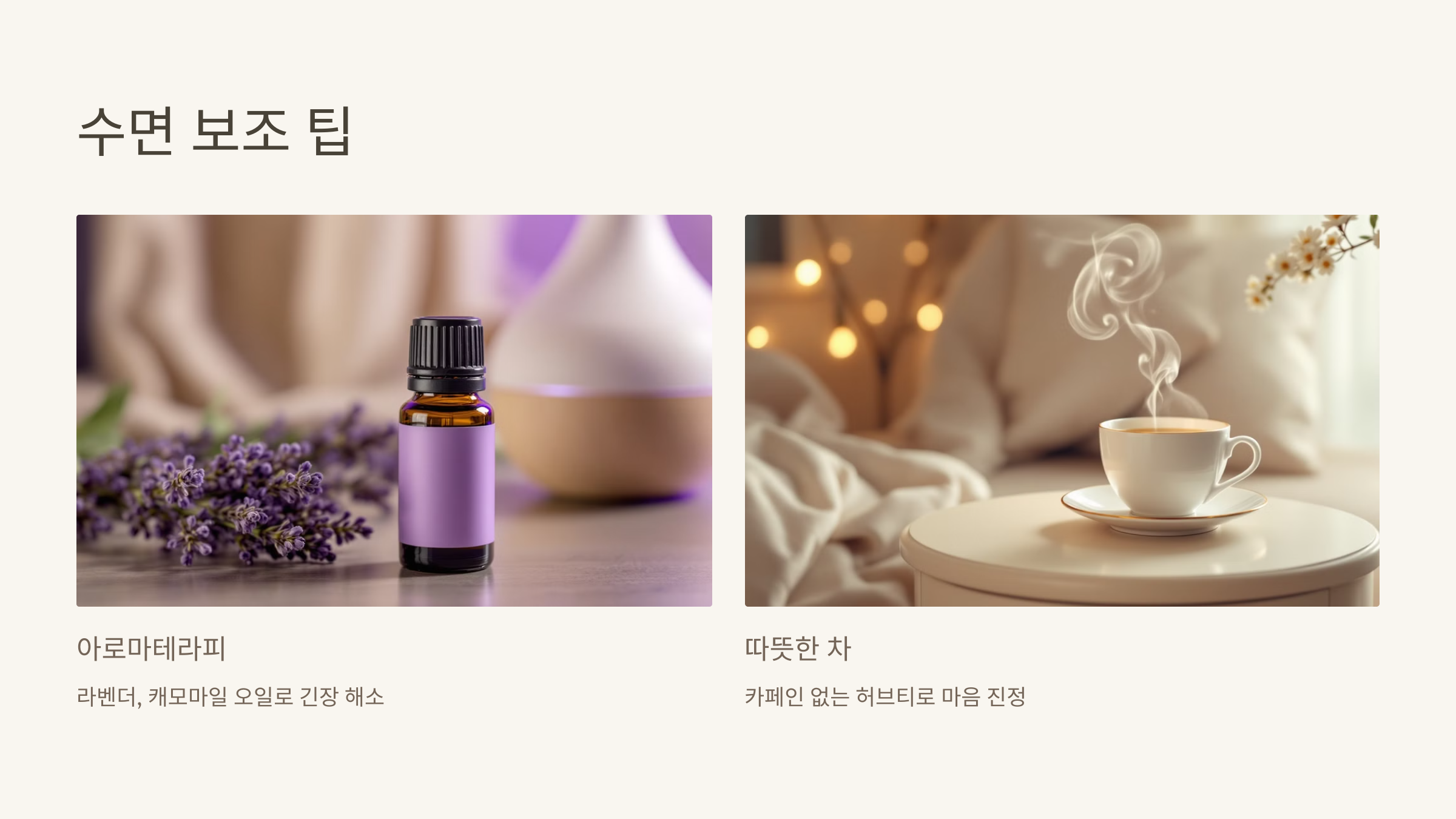 - 따뜻한 차 마시기: 자기 전에 따뜻한 허브티를 마시면 마음이 차분해져요. 캐모마일 차나 루이보스 차는 스트레스를 줄이고 수면을 촉진하는 효과가 있어요. 다만 카페인이 들어간 차는 피해야 해요!