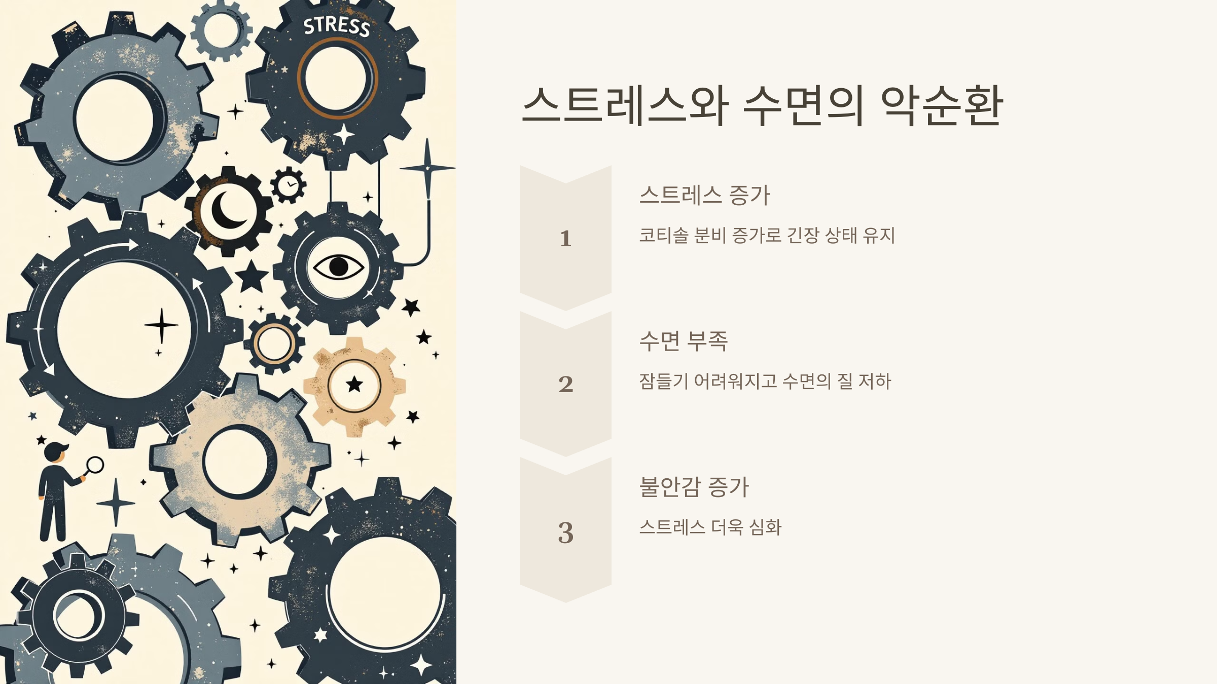 - 스트레스가 심하면 잠을 설치고, 수면 부족은 스트레스를 더 심하게 만들죠. "혹시 스트레스 때문에 밤새 뒤척인 경험 있으신가요?" 연구에 따르면, 만성 스트레스는 수면의 질을 크게 떨어뜨리고, 수면 부족은 불안감을 더 키워 악순환을 초래한다고 해요.