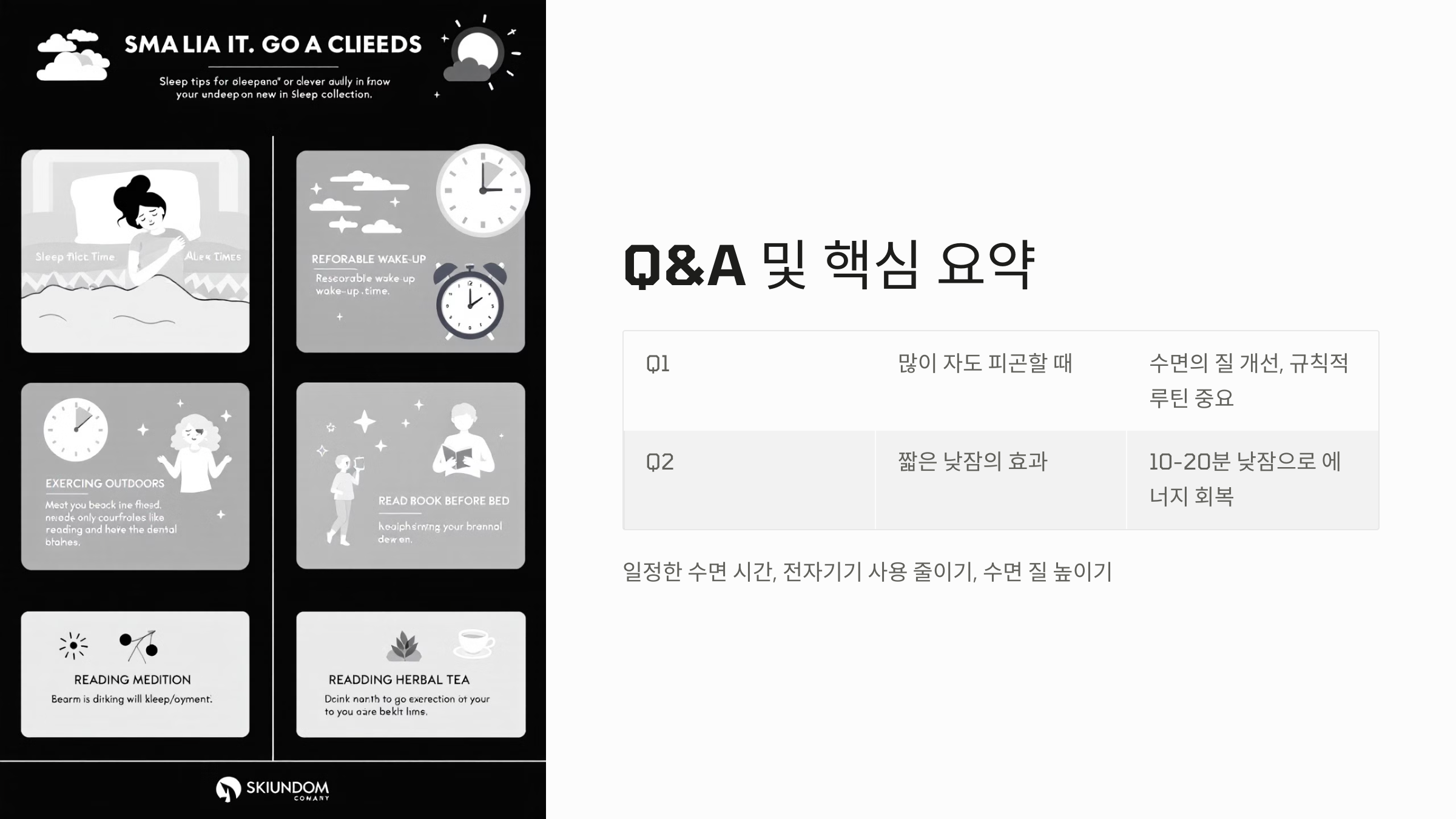 - 수면의 양보다 질이 더 중요할 때가 있어요. 깊은 수면이 부족하면 많이 자도 피곤할 수 있죠. 규칙적인 루틴을 만들어보세요.