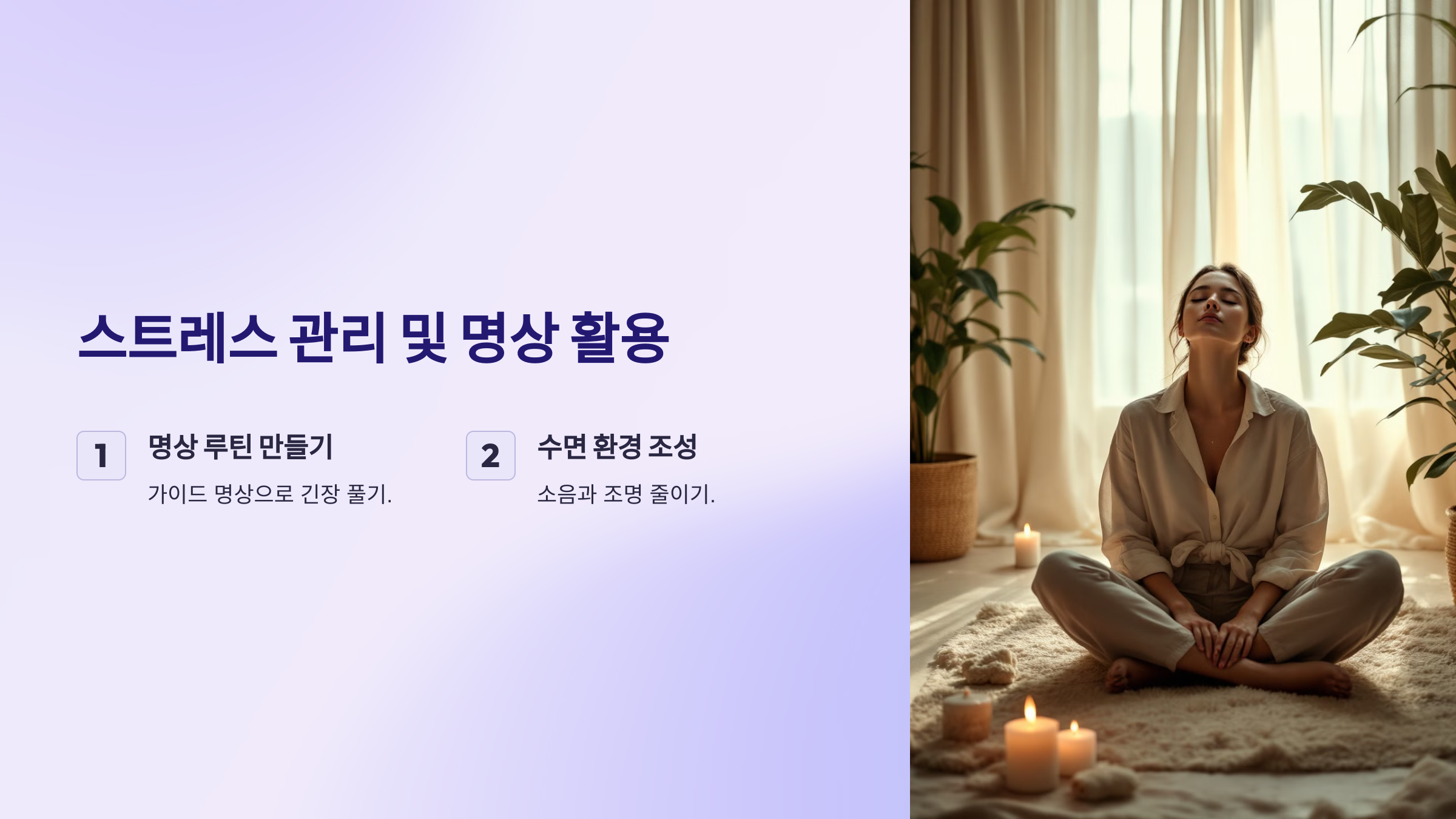 - 💡 사용 팁: 자기 전 10분 명상을 통해 마음을 차분히 가라앉히면 수면의 질이 크게 향상됩니다.