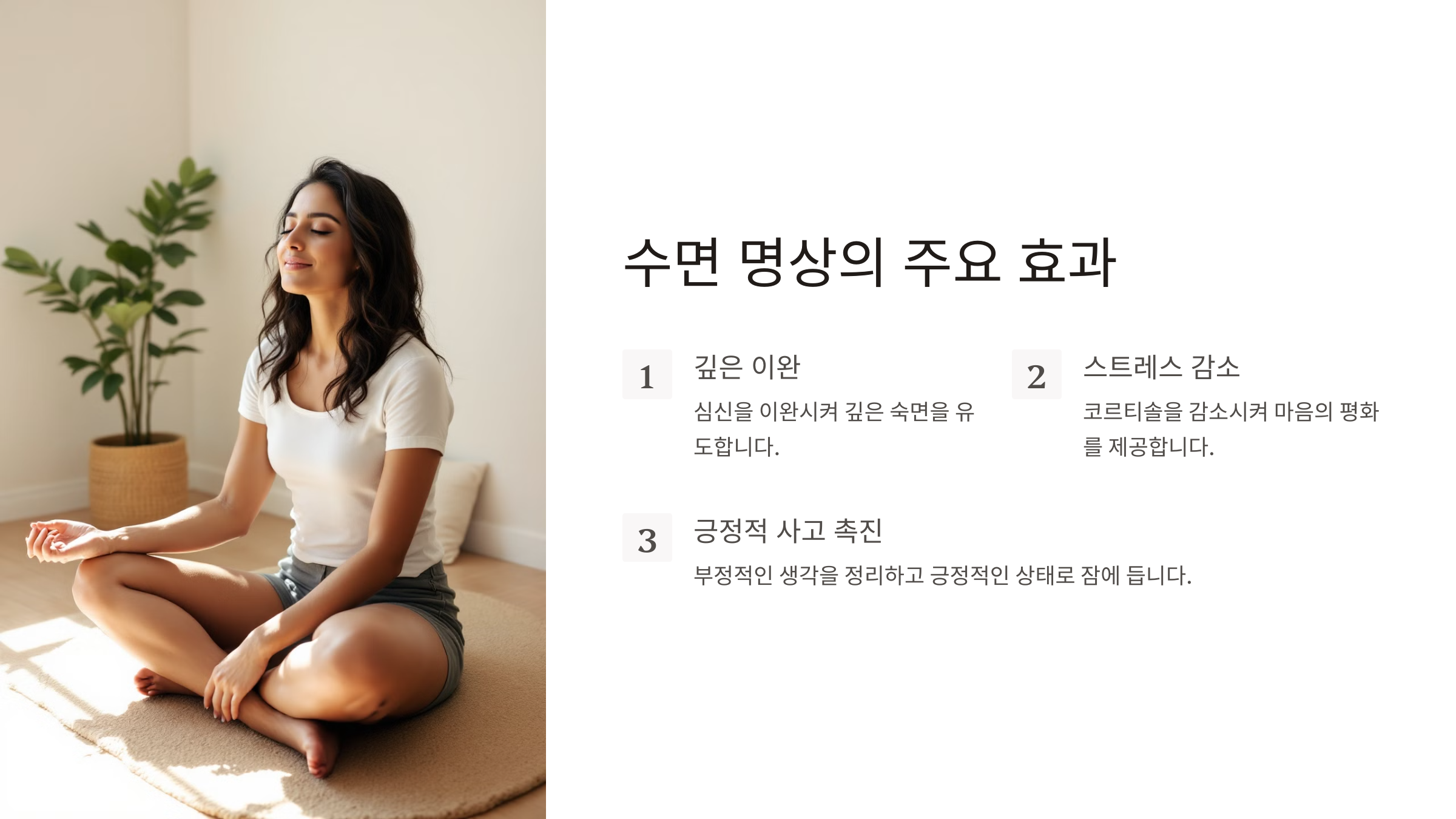 수면 명상은 심신을 이완시켜 깊은 숙면에 이르게 합니다. 이완된 상태에서 몸은 천천히 휴식 모드로 전환되고, 깊은 잠에 빠지면서 더 이상 깨어나지 않도록 도와줍니다.