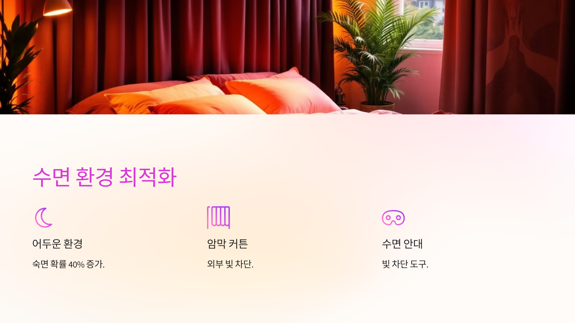 - 📊 데이터: 하버드 의과대학 연구에 따르면, 어두운 환경에서 자는 사람들은 밝은 곳에서 자는 사람들에 비해 숙면을 취할 확률이 40% 더 높다고 합니다.