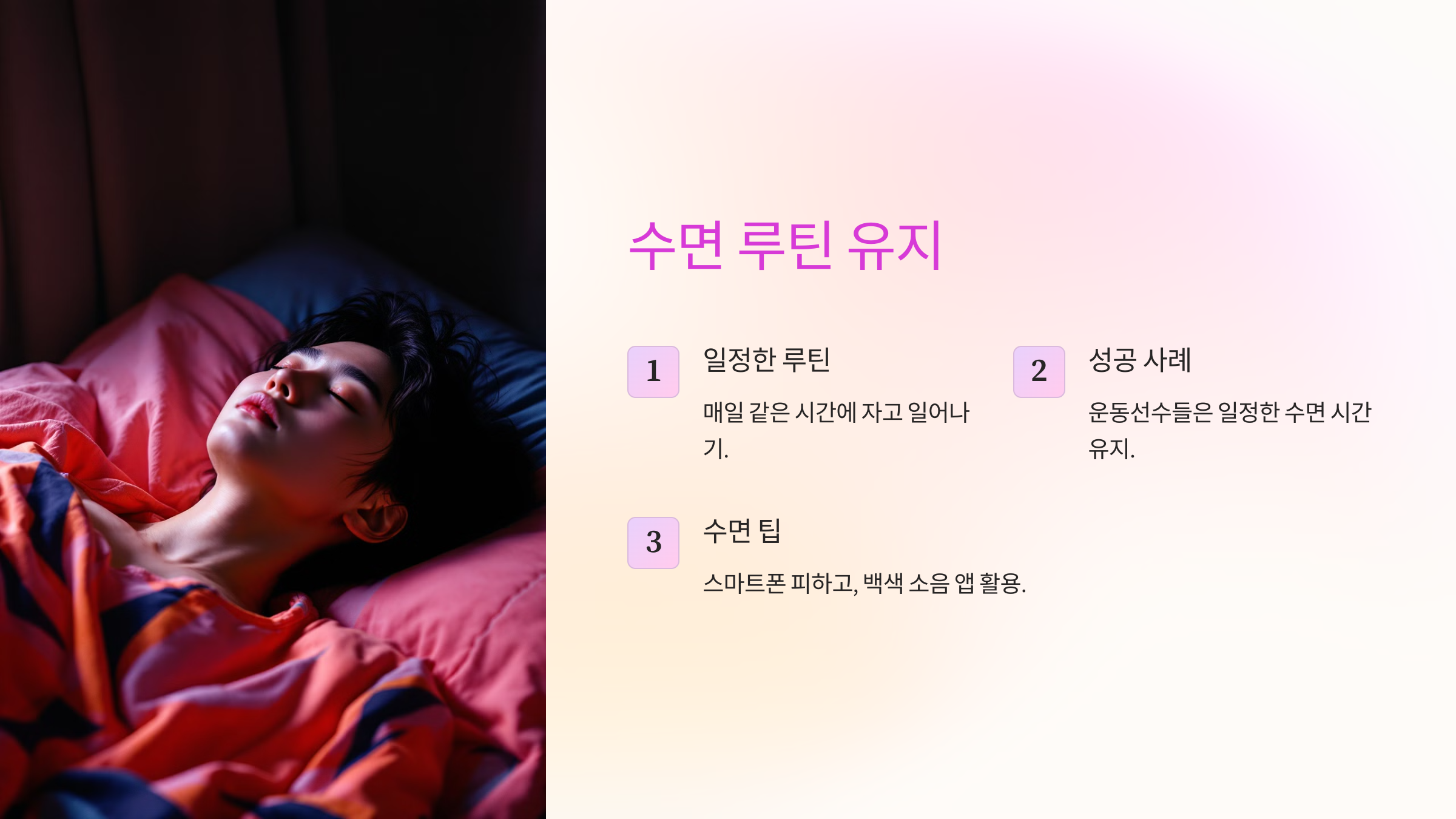 - 📌 사례: 많은 성공한 운동선수들은 경기력 향상을 위해 일정한 취침 및 기상 시간을 엄격히 지킵니다.