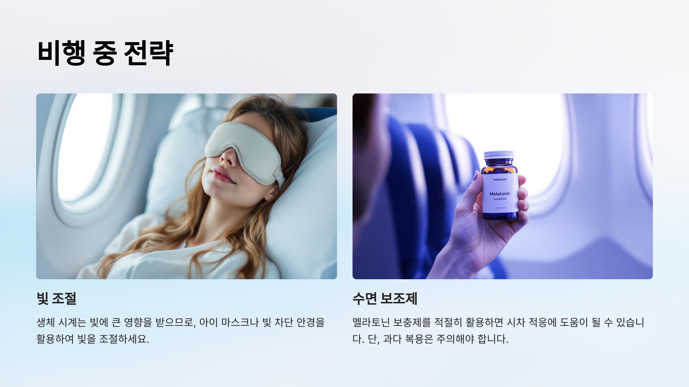 - 📝 비행 전 미리 수면 시간을 조정하고, 비행 중에는 빛을 적절히 조절하세요.