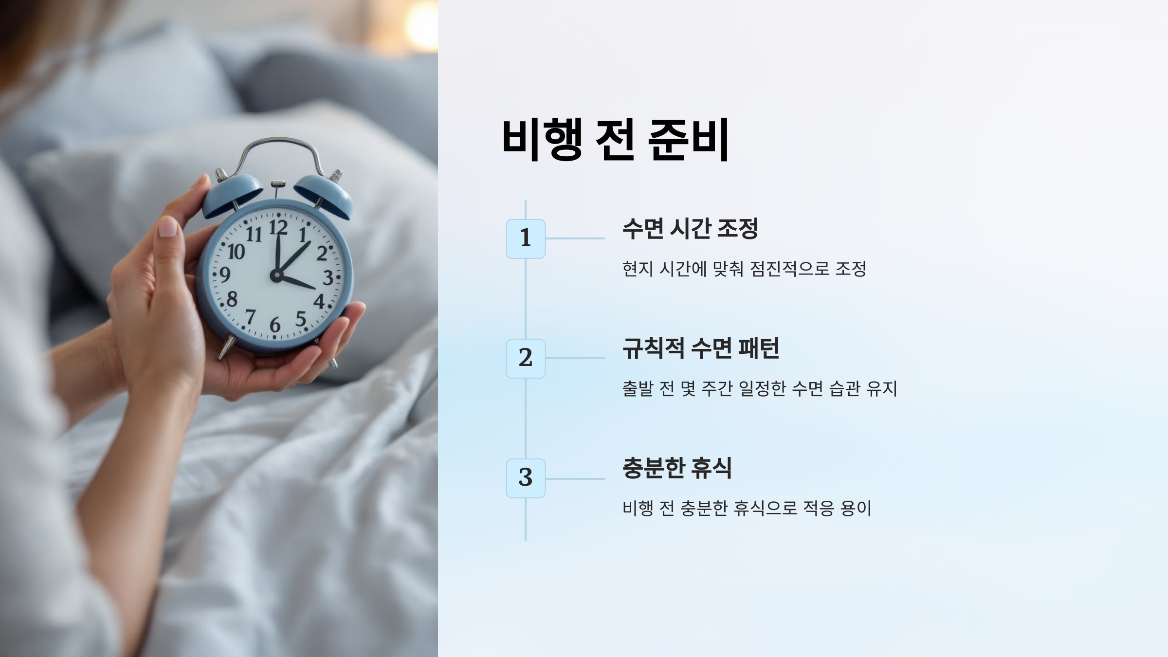 - 📝 비행 전 미리 수면 시간을 조정하고, 비행 중에는 빛을 적절히 조절하세요.