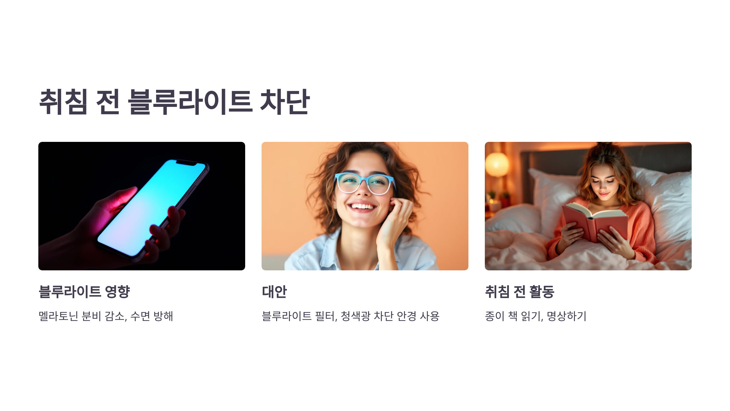휴대폰이나 태블릿에서 나오는 블루라이트는 수면을 방해할 수 있어요. 멜라토닌 분비를 줄이기 때문에 잠들기 어렵게 만들죠. 취침 전 최소 30분은 스크린을 멀리하는 것이 좋아요.