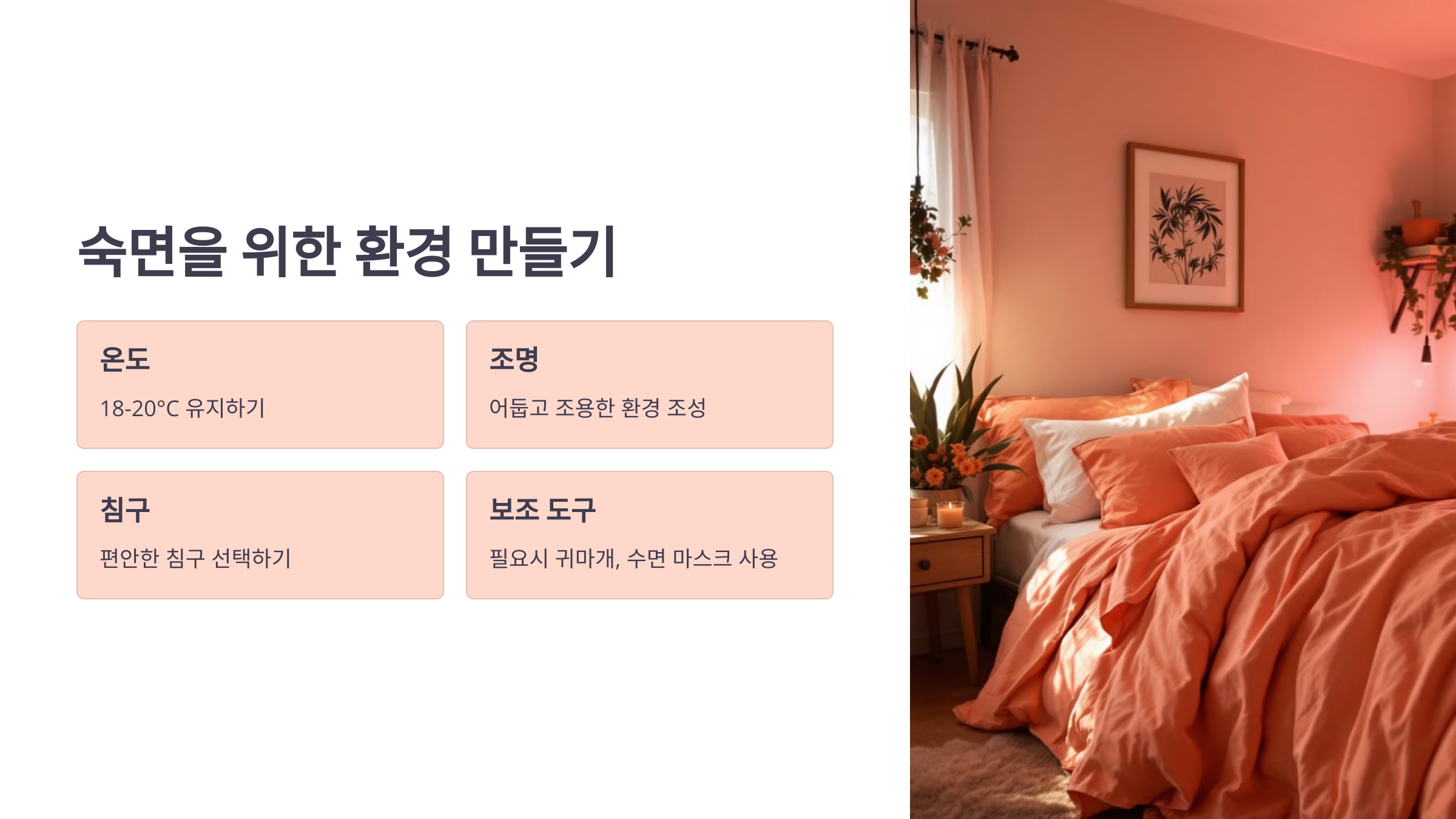 수면 환경이 쾌적할수록 깊은 잠에 들기 쉽답니다. 침실은 어둡고 조용하게, 쾌적한 온도로 유지하는 것이 중요해요. 침구도 편안한 것을 고르는 게 좋아요.