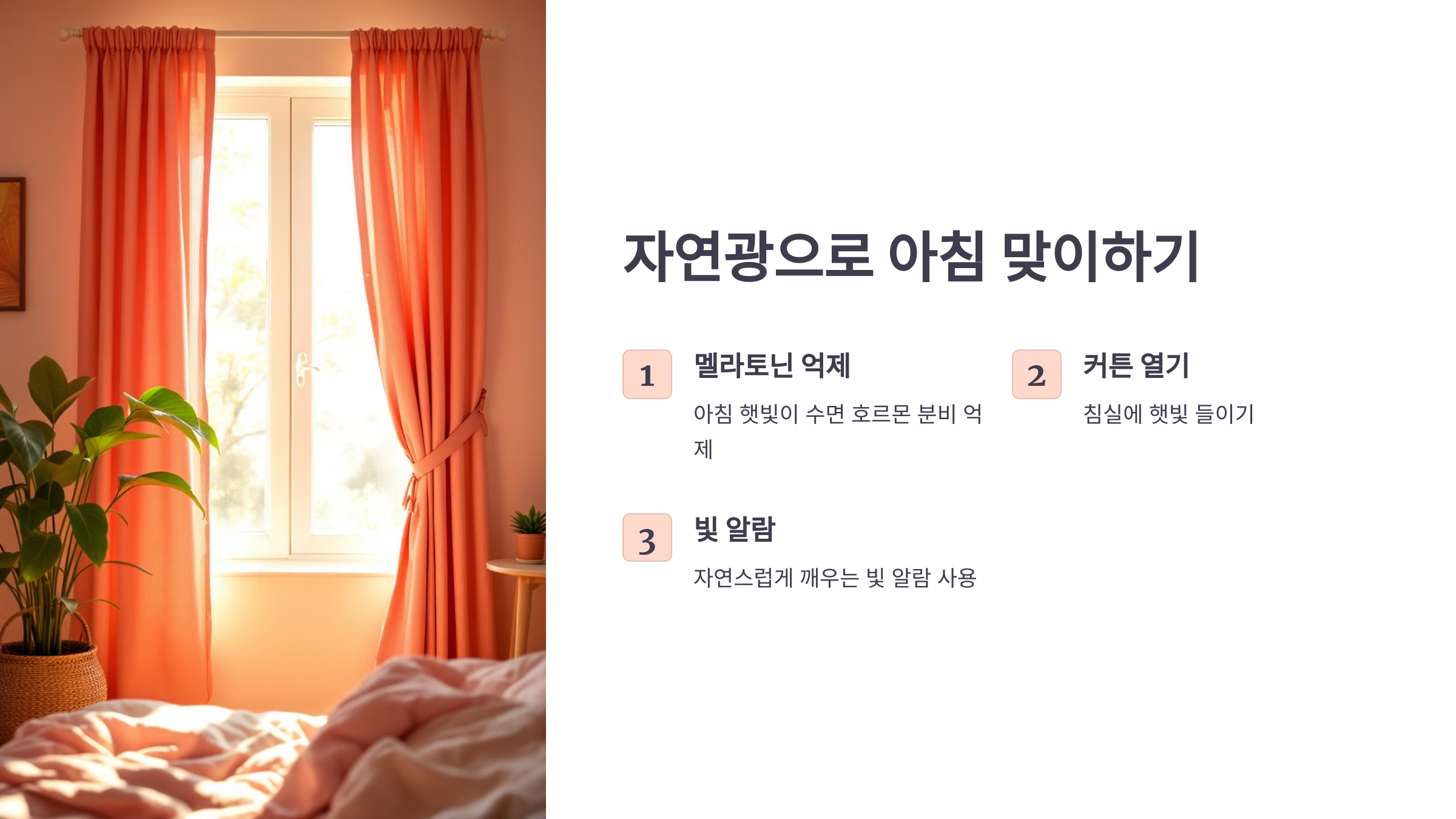 아침 햇빛은 우리 몸의 멜라토닌(수면 호르몬) 분비를 억제해 깨어나기 쉽게 도와줘요. 자연광이 뇌에 신호를 보내 깨어나도록 하기 때문이죠.