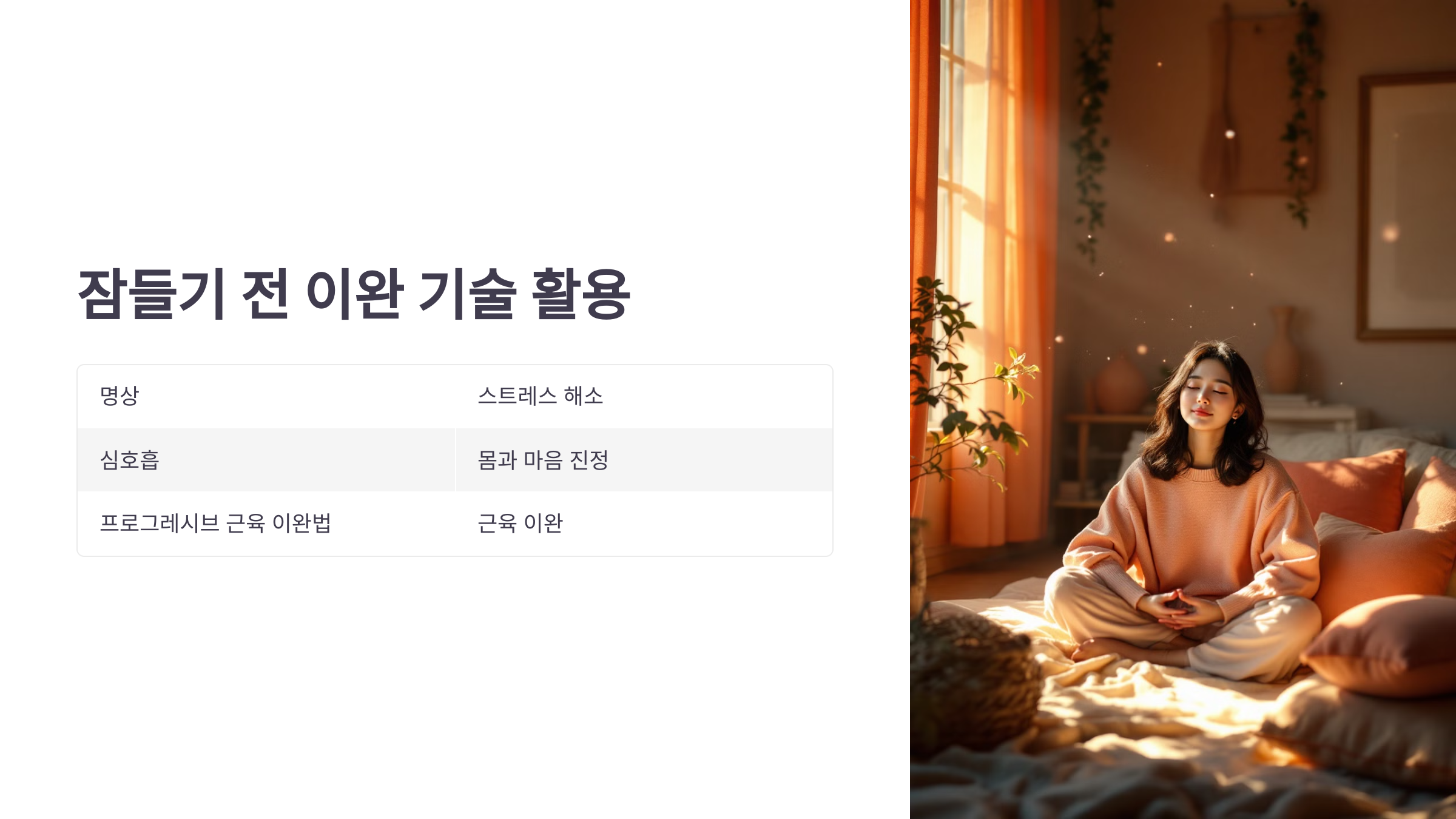 명상, 심호흡, 이완 운동 같은 기술을 활용하면 몸과 마음이 진정돼 숙면을 취하기 좋아요. 프로그레시브 근육 이완법은 스트레스를 풀어주기에 딱입니다.