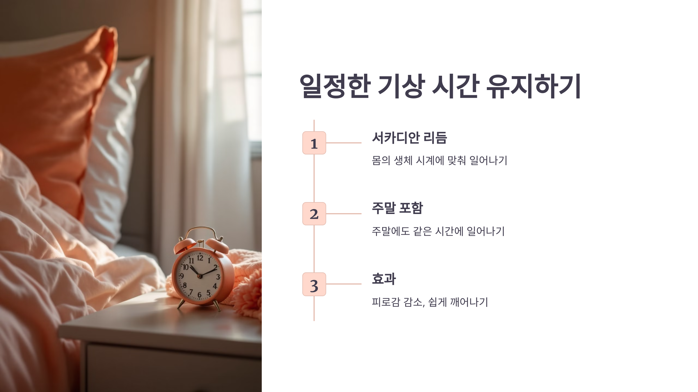 우리 몸은 생체 시계, 즉 서카디안 리듬에 의해 움직여요. 매일 같은 시간에 자고 일어나면 몸이 이 리듬에 맞춰져 더 쉽게 깨어날 수 있답니다.
