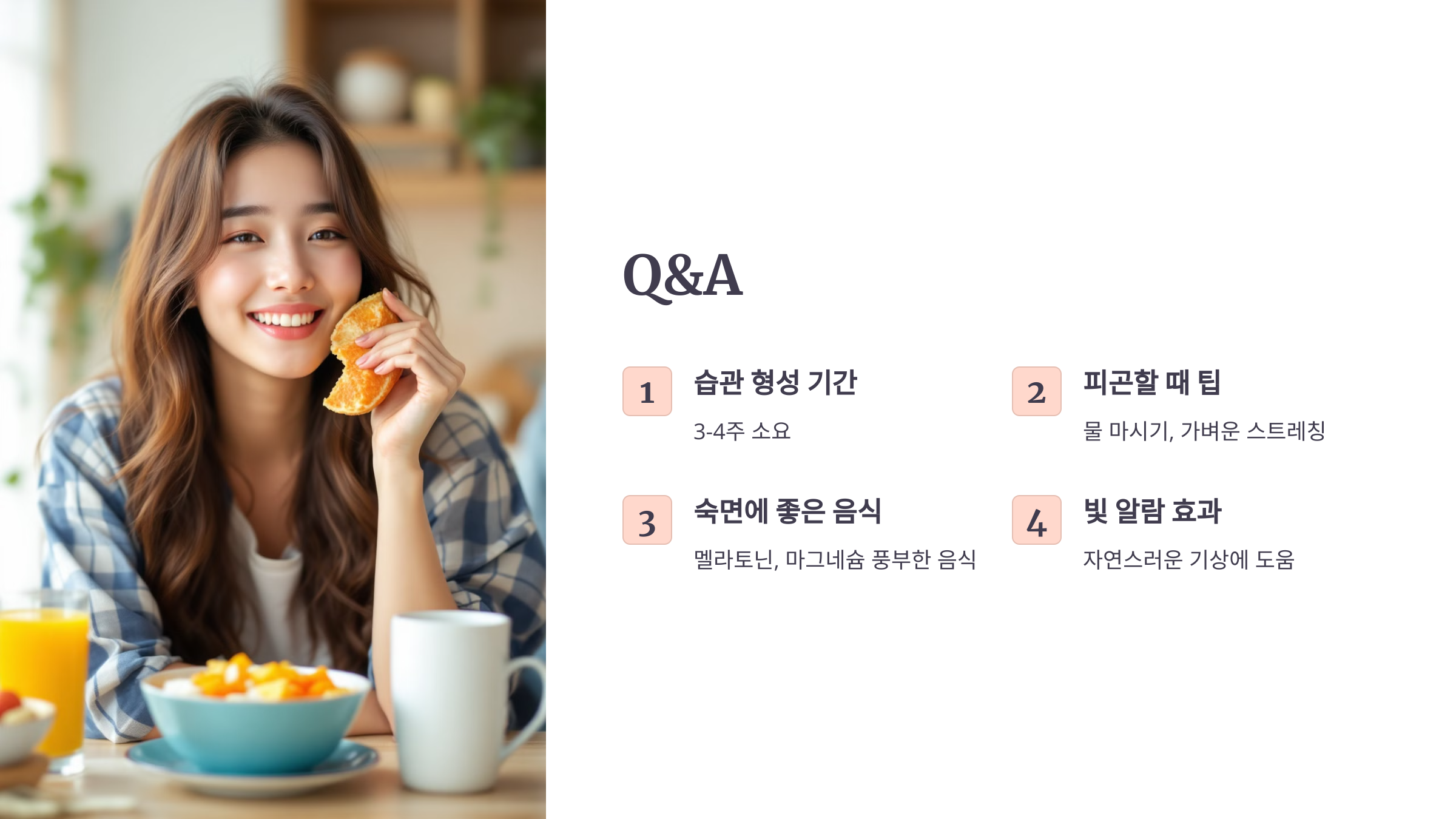 보통 새로운 습관이 자리 잡기까지는 3주에서 4주가 걸려요. 꾸준히 시도해보세요! - 아침에 너무 피곤할 때는?