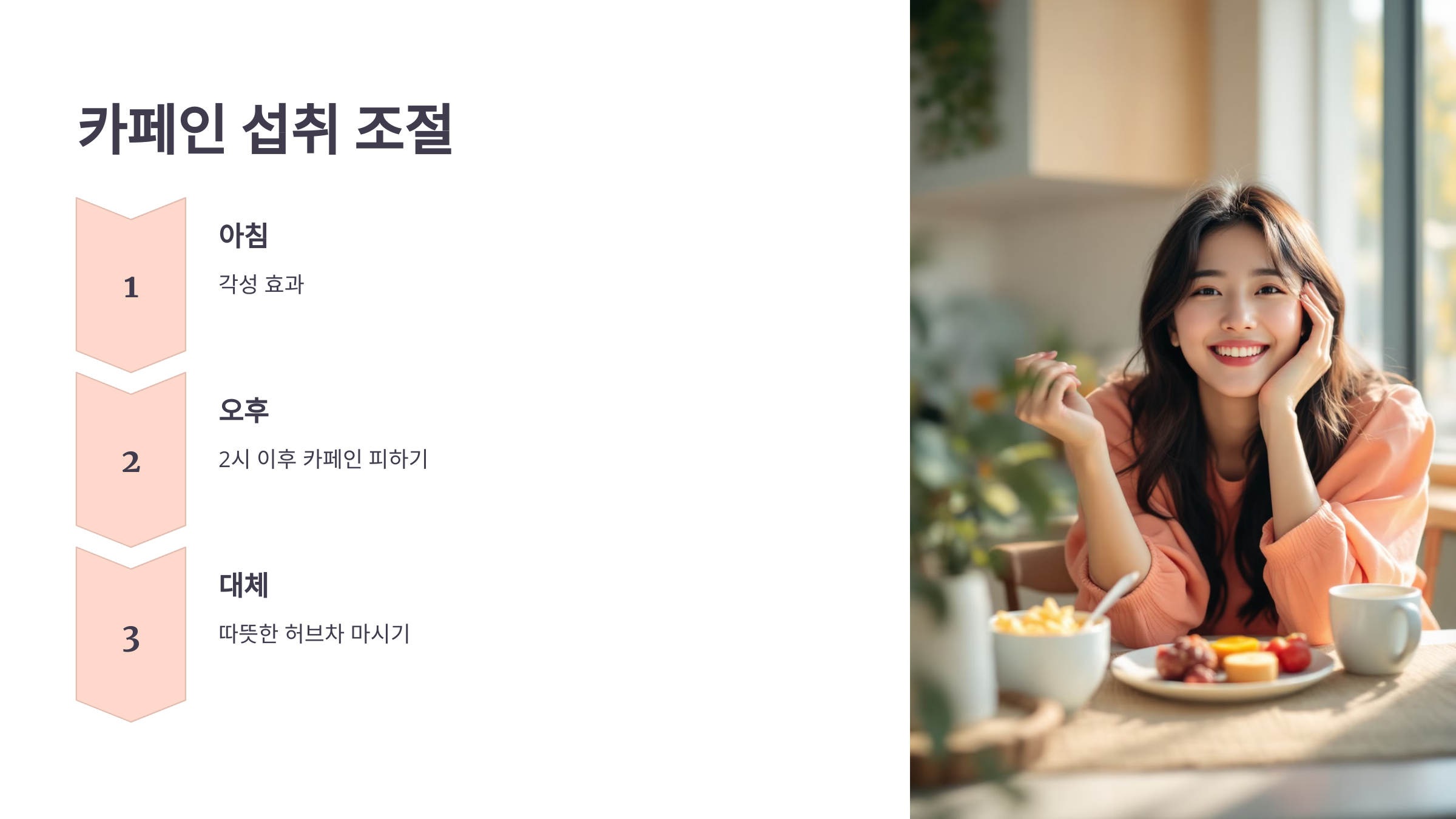 - 오후 2시 이후에는 카페인을 피하는 것이 좋아요.