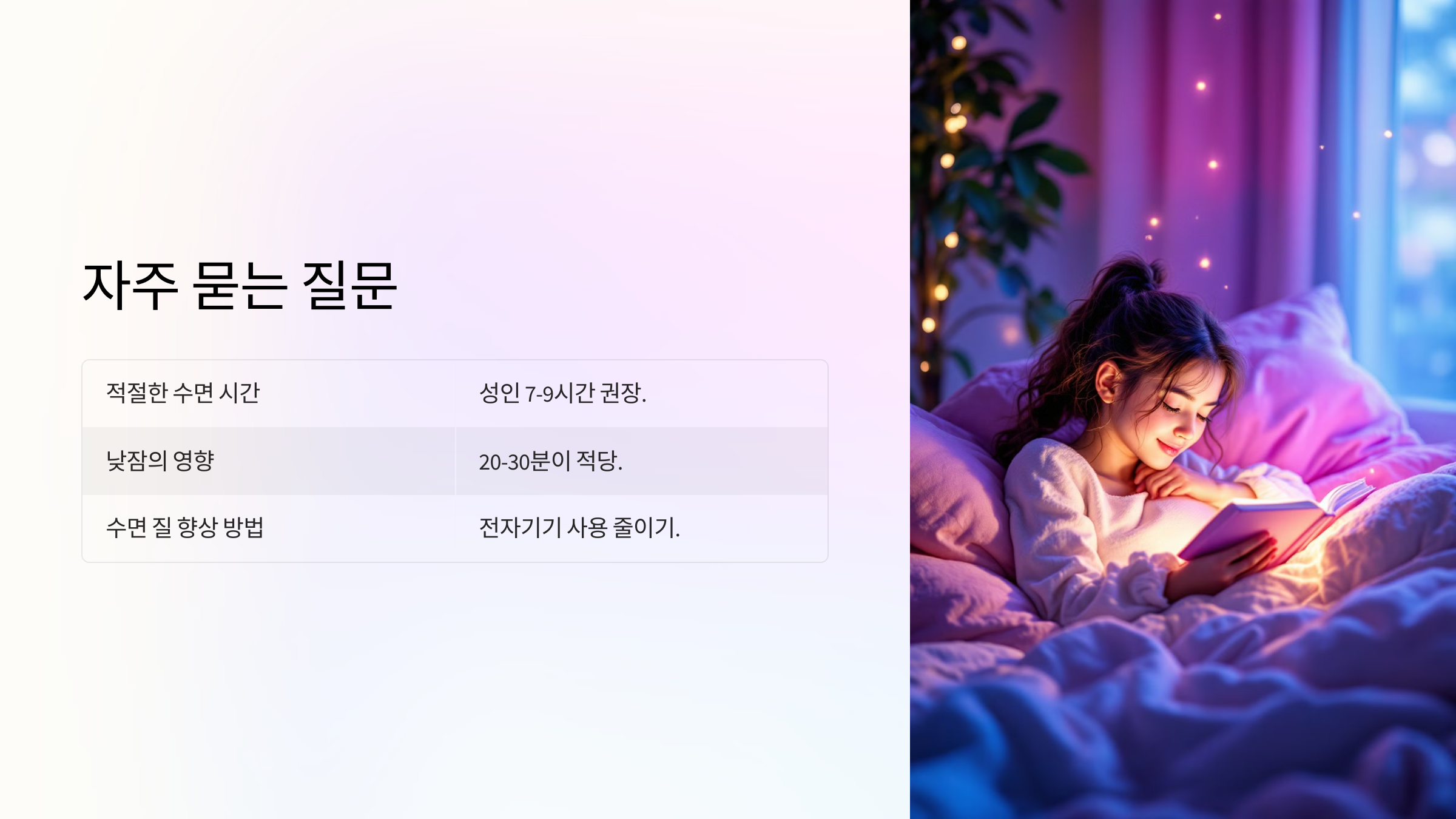 - 📝 실천 가능한 행동 순서: 규칙적인 수면 시간 정하기 → 전자기기 사용 줄이기 → 수면 환경 최적화