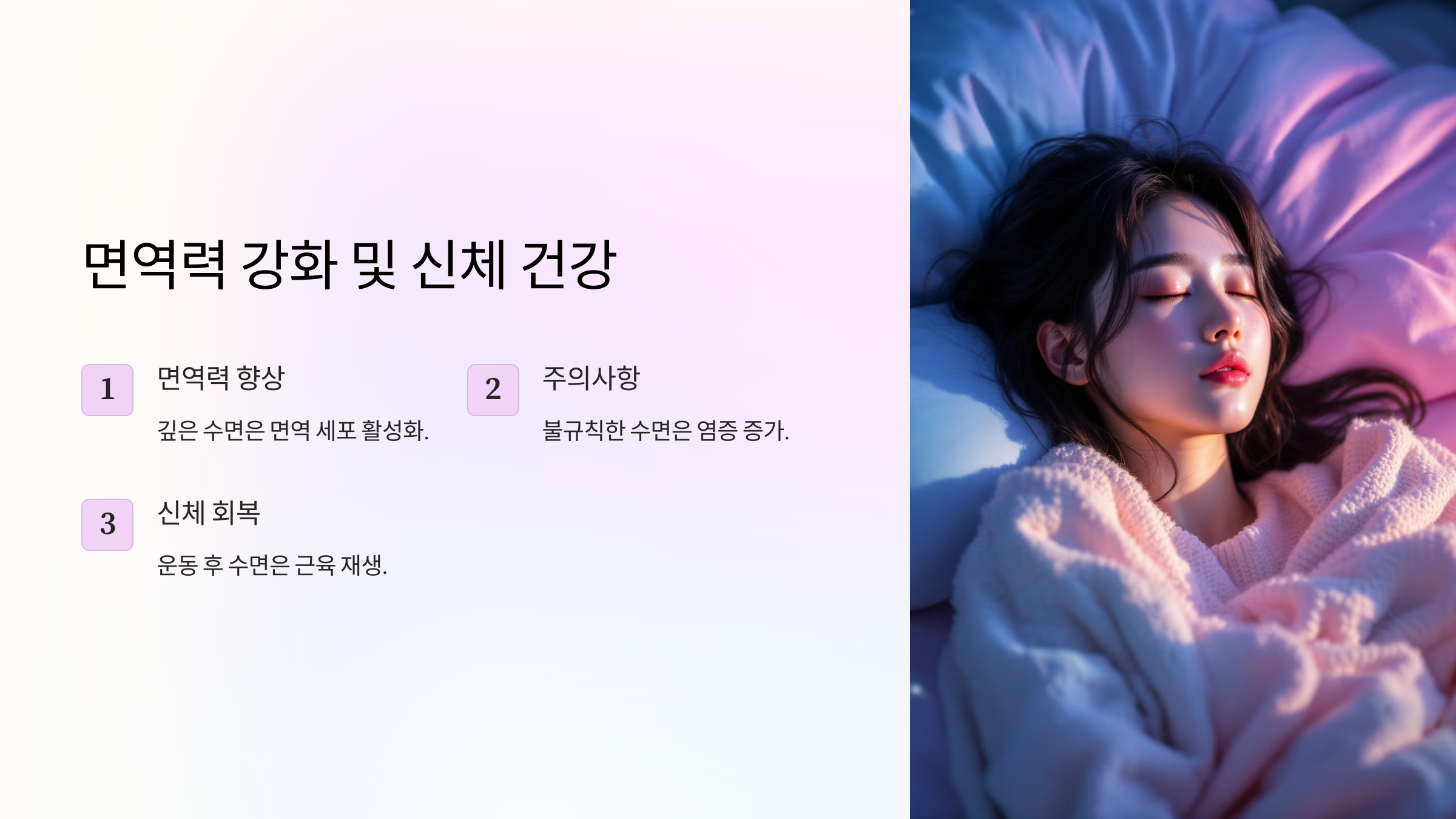 - 📌 면역력 향상: 깊은 수면 단계에서 면역 세포가 활성화되면서 신체 방어력이 강해집니다.